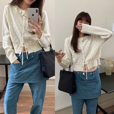 韓国ファッション レディース ニットカーディガン 可愛らしい丸ネック透かし彫りウエスト引き締め長袖ニットトップス カジュアルセーター
