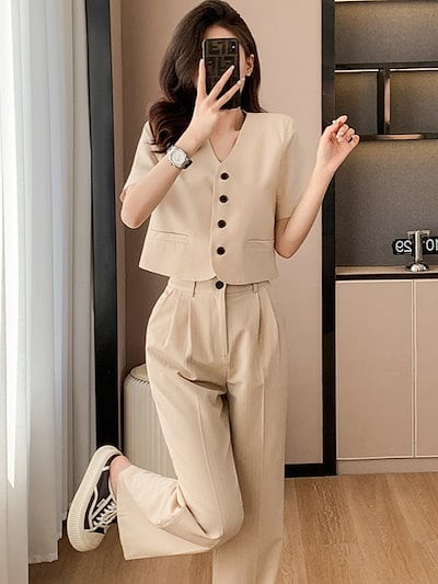ストライプ半袖ファッションスーツスーツ レディース2024夏新作スモールショートノーカラースーツワイドパンツ
