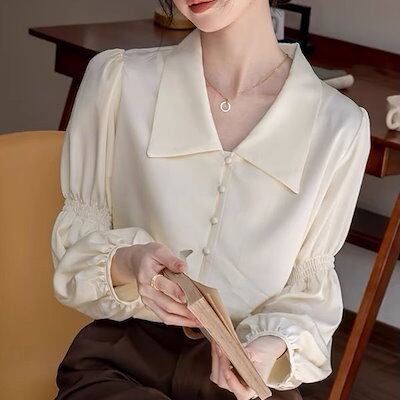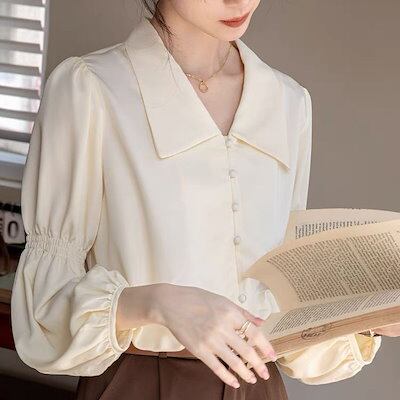 シフォンブラウス/オフィス通勤 シャツ/気質のトップス カジュアルシャツ シャツ 女性 スーツの襟 シフォン Vネック長袖トップス レディース シャツ02