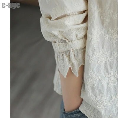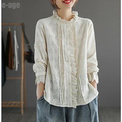 ブラウス 立ち襟 フリル シャツブラウス レディース コットン シャツ 長袖 綿ガーゼ 麻 ナチュラル風 刺 レース 通勤 カジュアル きれいめ ゆったり