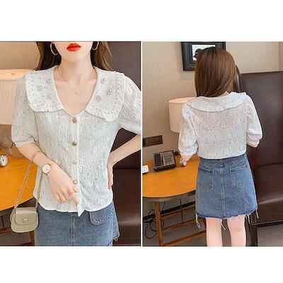 40代 春夏新作 半袖トップス オシャレブラウス レディース レース折り襟 パフスリーブブブラウス上品 通勤OL ブラウス ゆったりシャツ 大人 白シフォンシャツ