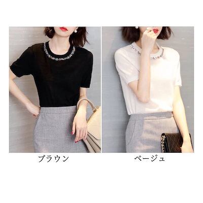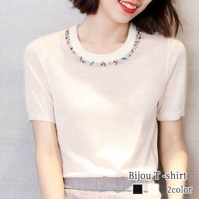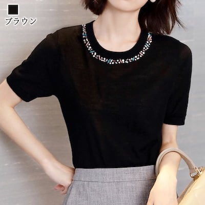 Tシャツ レディース ビジューTシャツ コーデ ブラウス ブランド ロング 薄手 半袖 かわいい 涼しい 大人 ブラック カジュアル ティーシャツ Vネック 7分袖 トレーナー 無地 人気 春 シャツ