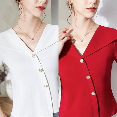 ブラウス レディース VネックボタンTシャツ 春 おしゃれ フォーマル カットソー カジュアル レース オフィス 半袖 白 シャツ リボン 事務服 Tシャツ 涼しい 大きいサイズ フリル 安い 人気