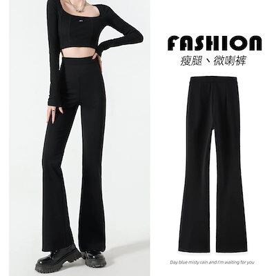 フレアーパンツ 着痩せ モップパンツ ハイウェスト 春夏 レディース ブラック