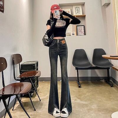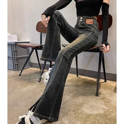 春 夏 スリット レディース ジーンズ新作ハイウエスト 着痩せ スリット フレアスズボン