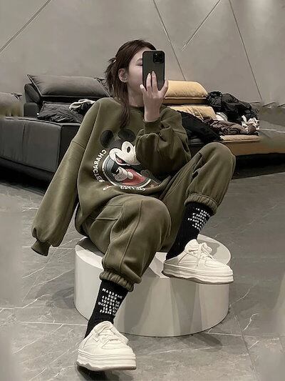 新しい 【2024新品入荷激安本日限定】ミッキープリントベルベットスポーツスーツレディース2024春ラウンドネックスウェットシャツとスウェットパンツツーピースフード付きスウェットシャツ