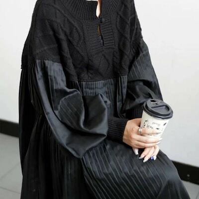 ロングワンピース 長袖 大きいサイズ きれいめ 切り替え レディース ニット ワンピ プリーツ ゆったり 体型カバー おしゃれ 大人可愛い ロングワンピ 黒