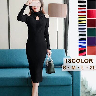 全13色 ニットワンピース タイトワンピース 胸開き オープンショルダー ニットワンピ 姫系ワンピース 冬ニットワンピース セクシー オフィスレディー ハイネック あったか 韓国 膝丈 長袖 冬 ブラ