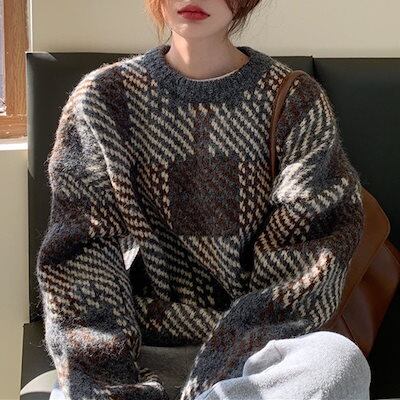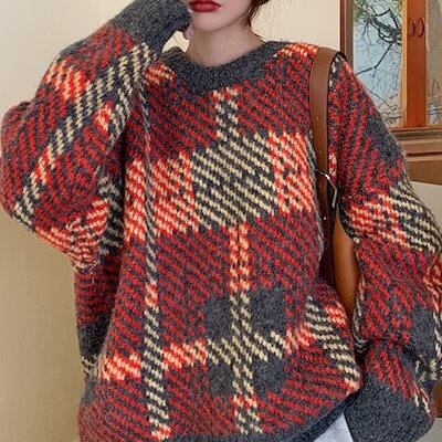 ベーシックニット ヴィンテージ ぶつかり合う色 ジャンパー レディース 秋と冬 ソフト ストライプ ゆったり のんびりスタイル チェック柄 ニット トップス 韓国ファッション