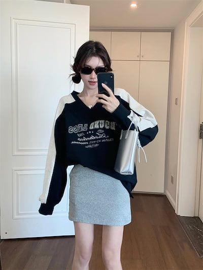 2024 秋冬トレンド トップス Vネック長袖かわいいTシャツレディース韓国風衣装ルーズゆったりカジュアルおしゃれサイズスリーブシルエットファッション系サイドシャツフットバイカラーニュートロ