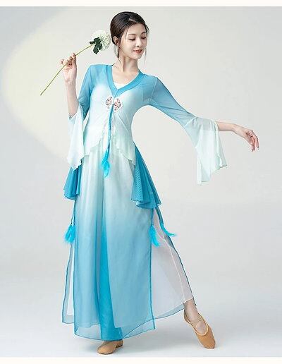 ダンス衣装 長袖 トップス ロング丈 シフォン ガウチョパンツ ワイド パンツ フレアスカート 美しい グラデーション ふんわり シフォン パンツ ダンス レッスン着 レディース 大人 ダンス 発表会