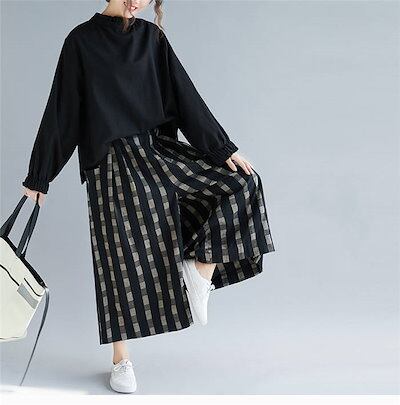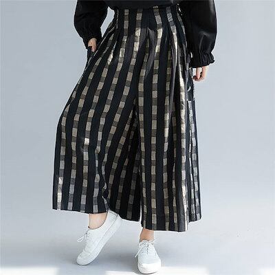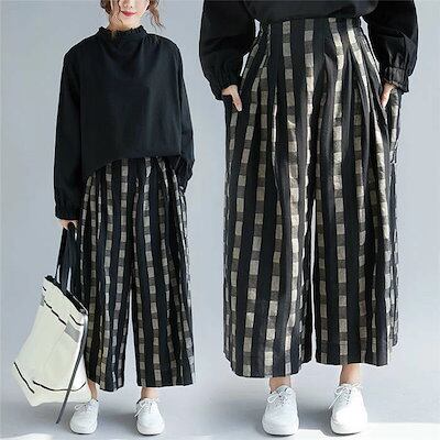 チェック柄 ワイドパンツ レディース ボトムス ガウチョパンツ ワイド パンツ フレアパンツ イージーパンツ 着回し ウエストバックゴム シンプル おしゃれ チェック ギャザー タック 綿麻調 春秋