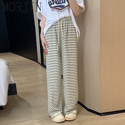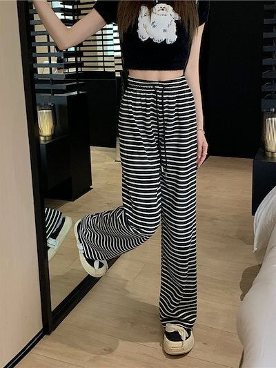 大きいサイズのストライプのワイドパンツの女性の夏の新型の3高腰の垂感はやせているストレートパンツを現します