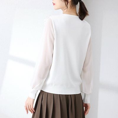 レディーストップス ブラウス カットソー デザインブラウス 襟 Vネック 長袖 トップス カジュアル 大人可愛い フェミニン 透け感 レトロ おしゃれ お出かけ デイリー 普段着 ホワイト ブラ