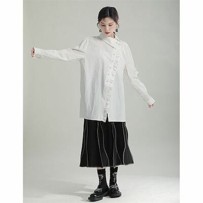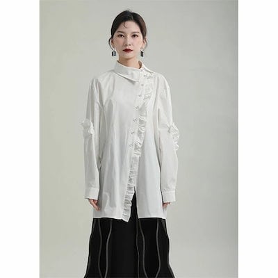 フリルブラウス シャツ ブラウス レディース トップス ロング丈 デザイン襟 長袖 斜めボタン 胸元フリル タック 無地 きれいめ モード系 変形デザイン アシンメトリーシャツ オケージョン きれいめ