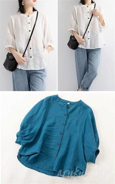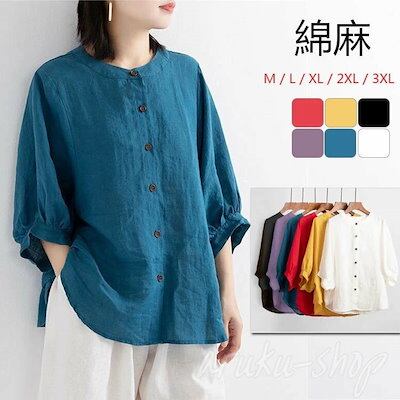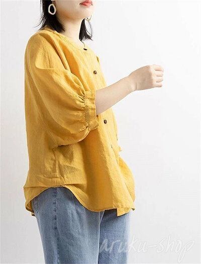 ドルマンスリーブ フリル バールン袖 五分袖 立ち襟 半袖シャツ リネンシャツ おしゃれ ボタン 麻 綿 レディース シャツ