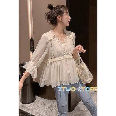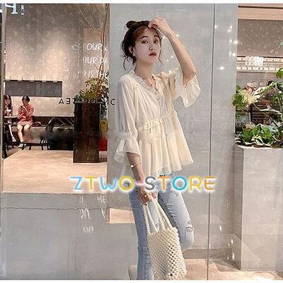 ペプラムトップス ブラウス レディース 五分袖 七分袖 キャンディスリーブ Vネック 立ち襟 フリル 裾フリル 大きいサイズ シアー袖 韓国 ファッション Aライン