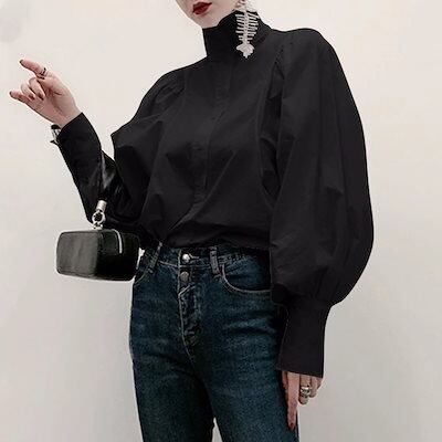 2024 ブラウス 立ち襟 ランタン袖シャツ ゆったり 無地 ブラウス 気質 着痩せ ワイシャツ 長袖 レディース トップス