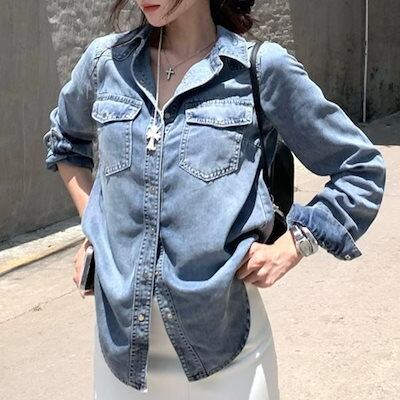 2024秋冬トップス シャツ デニム生地 ポケット 襟 スタンダードカラー ボタン 長袖 秋 青 ブルー おしゃれ かわいい 韓国ファッション レディース お出かけ安い