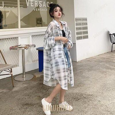今っぽシアーシャツ チェック柄 長袖 シャツブラウス レディース 透け感 シンプル 膝上 折り襟 ボタン カジュアル UV対策 トップス 春夏秋 ゆったり
