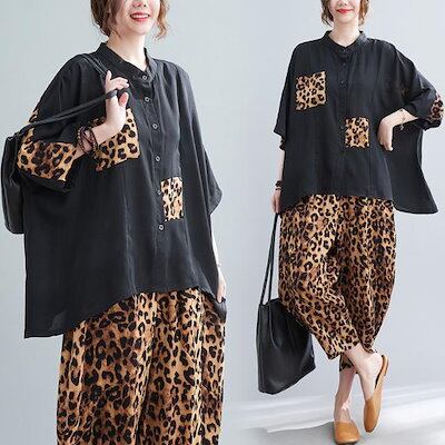 涼しく楽ちんセットアップ セットアップ 韓国ファッション 夏 セットアップ レディース スウェット 豹柄 切り替え 上下セット リネン素材トップス 福袋