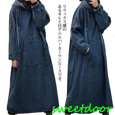 デニムワンピース ワンピース レディース デニムワンピ パーカーワンピース マキシワンピー 長袖 ロングワンピース プルオーバー マキシ丈 Aラインワンピース