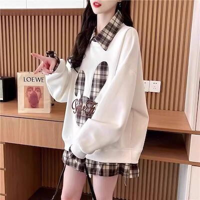 韓国 パーカー フェイク2ピース ベルベット スウェット レディース 秋と冬 ゆったり 大きいサイズ トップス