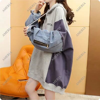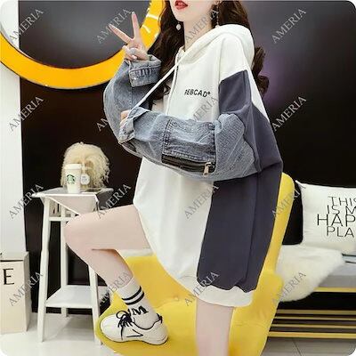 プルオーバー パーカー デニム切り替え オーバーサイズ 異素材mix スウェット 薄手 トップス 長袖 レトロ 韓国ファッション レディース 大人可愛い ガーリー