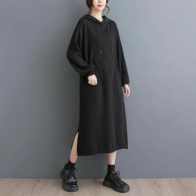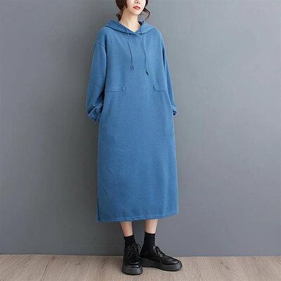 パーカーワンピース レディース フード付き ワンピース 無地 ロングワンピース フード 長袖 ロングパーカー 大きいサイズ ゆったり ミモレ丈 シンプル キレイめ 体型カバー カジュアル 大人可愛い
