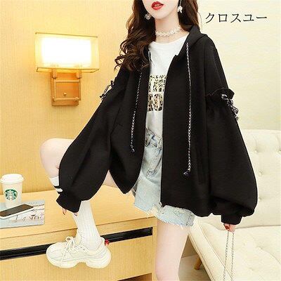 レディース パーカー スウェット ジャケット 長袖 パフスリーブ フード付き 蝶結び スポーツウェット ゆったり ゆるシルエット プルオーバー 秋物
