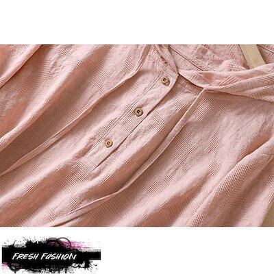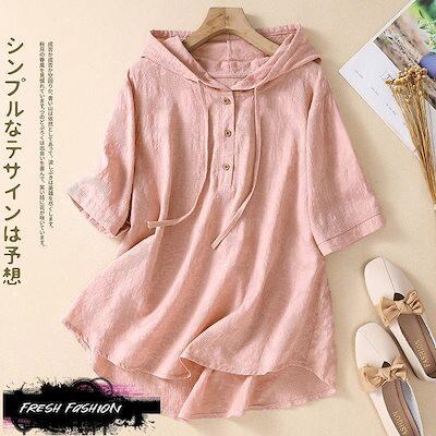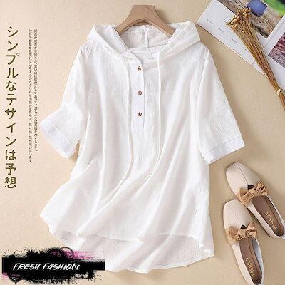パーカー Tシャツ レディース ブラウス 春 夏 秋 リネン フード付き チュニック 半袖 シャツブラウス 綿麻 トップス プルオーバー ゆったり