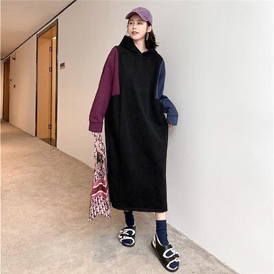 ロングパーカー パーカー フード付き 裏起毛 ワンピース マキシ レディース バイカラー 体型カバー アウター ゆったり 無地 大きいサイズ