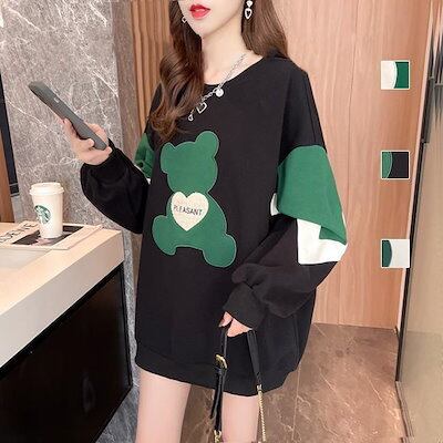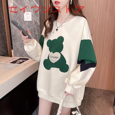 プルオーバー 裏起毛 ゆるトップス 保温防寒 長袖 クマ 配色 刺繍 可愛い ゆったり レディース トップス