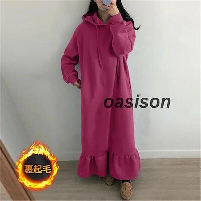 人気商品超目玉 裏起毛 ワンピース ボリューム袖 パーカーワンピース レディース 秋冬 長袖 暖かい 極暖 あったか ビッグシルエット ゆったり ロング丈 綿混