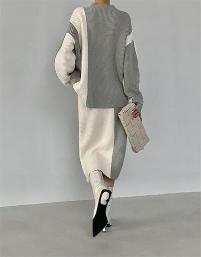 ニットセットアップ レディース ニットセーター スカート セットアップ 秋冬 長袖 ロング丈 ハイネック セーター タイトスカート プルオーバーセーター カジュアル 配色 黒 白 ゆったり 2点セット