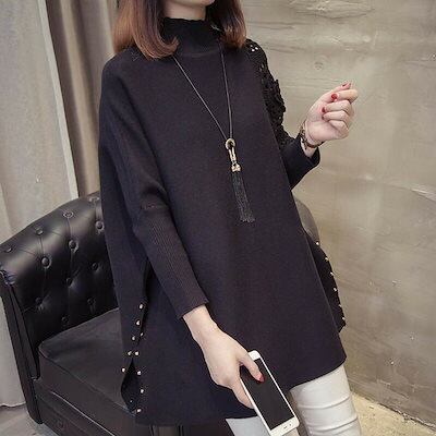 セーター ニット 長袖 ロング丈 ドルマンスリーブ レディース トップス チュニック ハイネック 透かし彫り アウター サイドスリット デザイン袖 ゆったり デザイン ファッション お洒落 コーデ カ