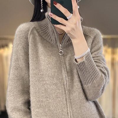 ピュアウール ニット ジッパー カーディガン レディース スタンドカラー 万能 無地 100 ウール アウター トップス