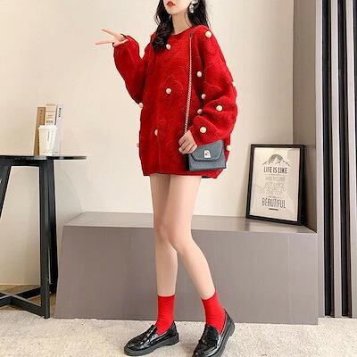 ニット セーター レディース 赤ニット トップス プルオーバー ニットソー 切替 長袖 ニット アウター ニットセーター 赤セーター オーバーサイズ ゆったり 長袖 秋 トップス 部屋着 uネック ル