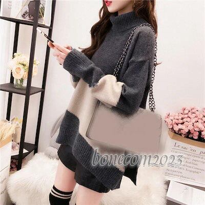 トップス代長袖 ニットソー オシャレ ニットトップス 配色 ハイネックセーター 通勤 秋冬 レディース ニットセーター 着痩せ オシャレ ゆったり 韓国風