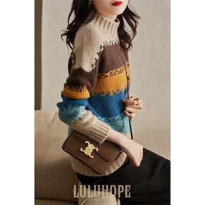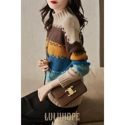 セーター 大人ニットインナー代 ニットトップス ショット丈 秋冬代長袖セーター ゆったりプルオーバー ボーダー柄ハイネック レディース 厚手 オシャレ
