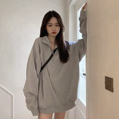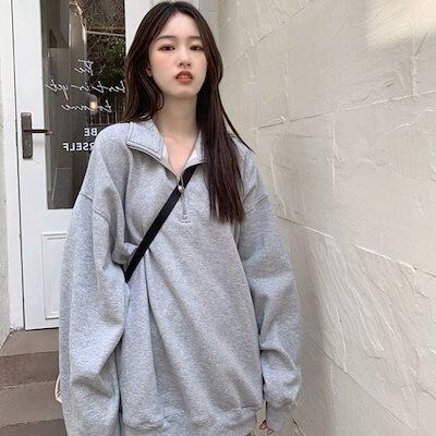 2024 秋冬 薄手 大人 トップス長袖かわいいプリントK-POPTロングレディース韓国風衣装カラールーズゆったりカジュアルハーフおしゃれサイズスリーブシルエットファッション系サイドシャツグレー