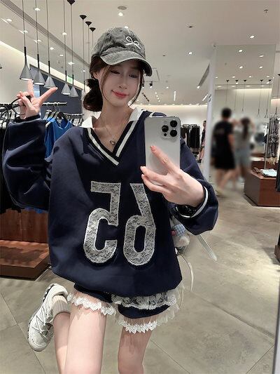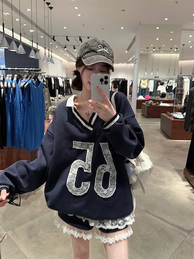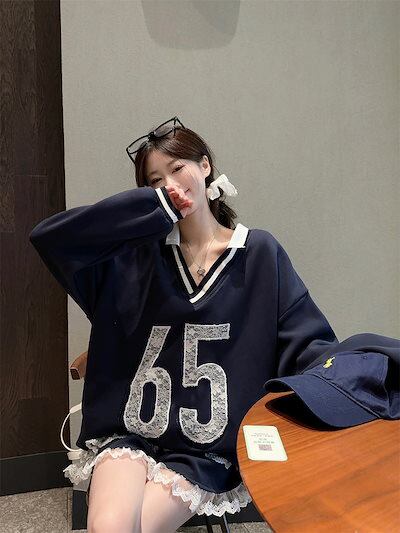 2024 秋冬 トレンド トップス 長袖 かわいい Vネック Tシャツレディース韓国風ロゴ衣装ルーズゆったりカジュアルおしゃれサイズスリーブシルエットファッション系サイドシャツフット