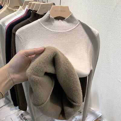 人気なリブニット 裏起毛ファッション カシミヤタッチハイネック 長袖 ニットトップス 百掛けインナー 冬 裹起毛 超保温セーター レディースベーシックニット厚手ニット秋冬タートルネック