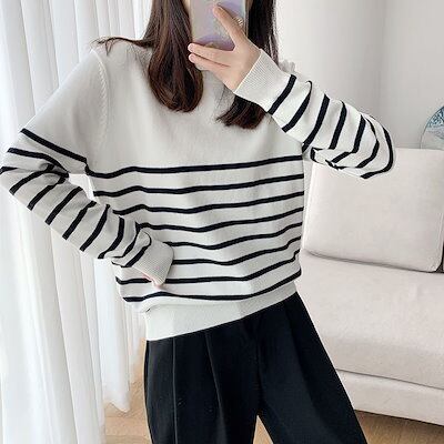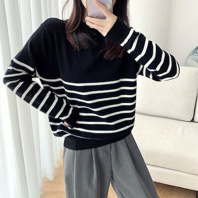 人気なリブニット 韓国ファッション 着痩せ ラウンドネックニットセーター レディース 秋冬 百掛け ベーシックニット流行り ストライプセーター ゆったりカシミヤタッチトップス