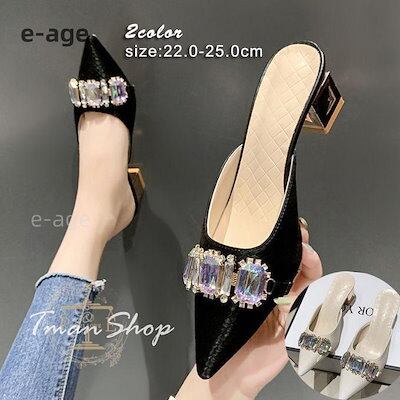 パンプス ミュール レディース ブロックヒール ポインテッドシューズ ピンヒール ラインストーン飾り キラキラ おしゃれ 疲れにくい 歩きやすい 美脚 春秋夏