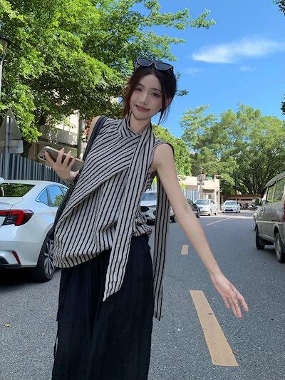 2024夏トップス シャツ ハイネック ストライプ ノースリーブ ゆったり 細見え 夏 黒 ブラック おしゃれ かわいい 大人っぽい 韓国ファッション レディース お出かけ