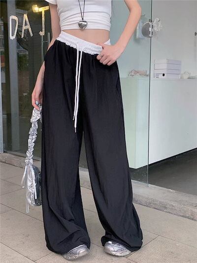 2024 春夏パンツ モップパンツ ロング丈 ワイド ハイウエスト 美脚効果 脚長効果 細見え 夏 青 黒 おしゃれ かわいい 韓国ファッション レディース お出かけ