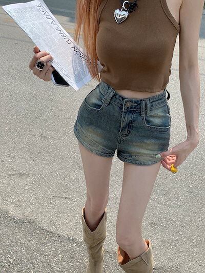 2024 春夏パンツ ショート丈 デニム ジーンズ スリム スキニー ウォッシュ加工 ハイウエスト 美脚効果 脚長効果 細見え 夏 おしゃれ かわいい 韓国ファッション レディース お出かけ
