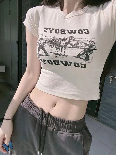 2024 夏 韓国 甘い トップス Tシャツ ラウンドネック丈 休日 フレンチ 韓国 ブラウス ファッション タイト スリムフィット丈短め ショート レディース へそ出し 休日 おしゃれ T