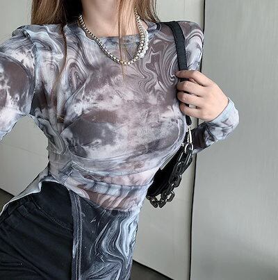 2024 夏 韓国 女度を格上げ tシャツ ファッション トップス 薄手 韓国系 長袖 薄手フィット プリント レイヤード 重ね着 肌見せ 女っぽハイフレンチタイト丈 レディース T